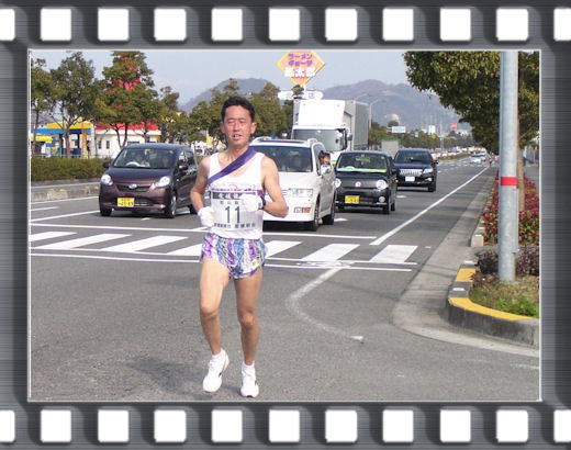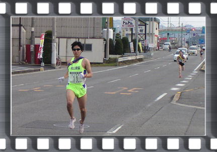 3km辺りから徐々に遅れ、最後尾のパトカーの後ろから黄色のユニフォームが見え始める。